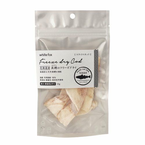【内容量】12g、90g 【原材料】真鱈(北海道産) 【成 分】粗たんぱく質86.1%以上、粗脂肪2.1%以上、粗繊維0.0%以下、粗灰分5.6%以下、水分2.3%以下 エネルギー:319kcal / 100g 【パッケージサイズ】12g:W120×H205×D35mm 、90g:W200×H280×D50mm 【賞味期限】14ヵ月 【原産国】日本(北海道)