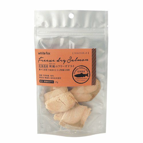 【内容量】17g、120g 【原材料】秋鮭(北海道産) 【成 分】粗たんぱく質81.3%以上、粗脂肪8.6%以上、粗繊維0.0%以下、粗灰分4.7%以下、水分1.4%以下 エネルギー:358kcal / 100g 【パッケージサイズ】17g:W120×H205×D35mm 、120g:W200×H280×D50mm 【賞味期限】14ヵ月 【原産国】日本(北海道)