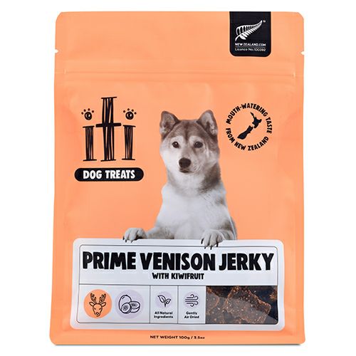 【内容量】100g 【原材料】ベニソン、ベニソン内臓、ブラウンシュガー、キウイフルーツ、シーソルト、ナチュラルフレーバー、ガーリック、アップルサイダービネガー、ミックストコフェロール(酸化防止剤) 【成分値】粗たんぱく質 26%以上、粗脂肪 10%以上、粗繊維 2%以下、粗灰分 8%以下、水分 20%以下 カロリー:355kcal/100g 【原産国】ニュージーランド