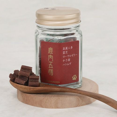 五膳シリーズとは 山田漢方薬局の監修のもと、全ての製品に高麗人参・霊芝・ローヤルゼリー・かき殻・ハトムギを配合。 美味しく食べながら愛犬の健康維持をサポートすることができるおやつシリーズです。