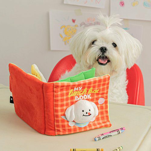 ポイント ● 6ページにもわたる本型おもちゃ ● ピーピー音やカシャカシャ音で愛犬の好奇心を刺激 ● 各ページにおやつを隠すことができるポケット付き ● ストッパーなど、難易度が調節できる仕掛けも用意