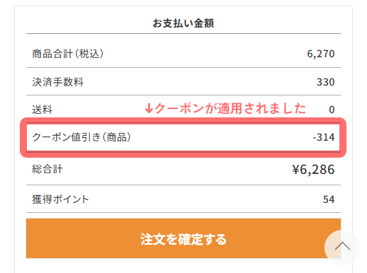 - ご注文内容を確認していただき、「お支払い金額」の内容に「クーポン値引き(商品)」と表示され、金額が引かれていることをご確認ください。