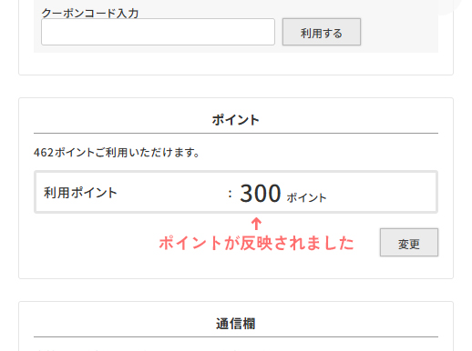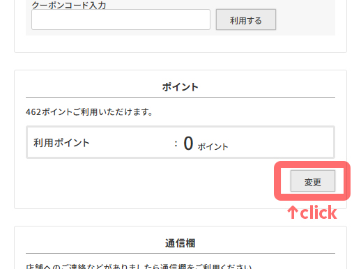 - 「ご注文手続き」の画面でお支払い方法をご選択いただき、「ポイント」の 箇所の「変更」ボタンをクリック