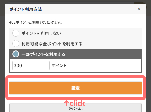 - ポイントを全ポイント使用するか、一部ポイントを使用するか選択し「設定」をクリック